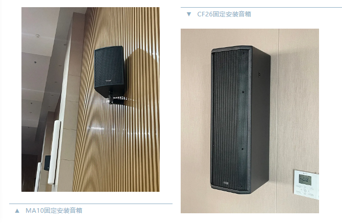 本次項目中兩間多功能報告廳,宴會廳的主擴聲系統均采用Mission Pro(英國美聲)MA系列音箱系統,新聞發布室、情景實訓室及9間教室,均采用CF系列固定安裝音箱系統,會議室采用CV6-16吸頂音箱,本次項目所有場景的驅動揚聲器系統皆采用MI系列數字功放。