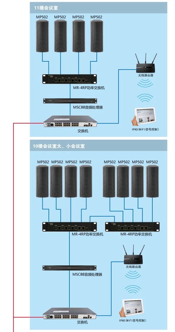 在此次項(xiàng)目設(shè)計(jì)中,工程商選用了Mission Pro MP全頻系列中的MP-502作為會(huì)議室和多功能廳的主擴(kuò)揚(yáng)聲器。MP-502為雙5.5寸有源壁掛音箱,內(nèi)置Dante與D類功放模塊,通過(guò)一根網(wǎng)線進(jìn)入系統(tǒng)MR-4RP功率交換機(jī);MR-4RP通過(guò)網(wǎng)線連接MSC-88音頻處理器,最終通過(guò)網(wǎng)線連接主交換機(jī),無(wú)需輸出模擬信號(hào),通過(guò)Dante網(wǎng)絡(luò)傳輸協(xié)議進(jìn)行數(shù)據(jù)處理。整座大廈采用了整合性極高的多功能分布式云控制系統(tǒng)。