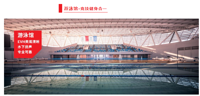 游泳館除了設(shè)有標(biāo)準(zhǔn)競賽游泳池、訓(xùn)練池外,還設(shè)有各種水療休閑設(shè)施、部分水上用品商業(yè)以及兒童娛樂池和滑道等,供普通市民休閑娛樂使用。在游泳館頂部,業(yè)主同樣選用了白色EVH系列揚聲器,在美觀度和品質(zhì)方面和場館高度統(tǒng)一。