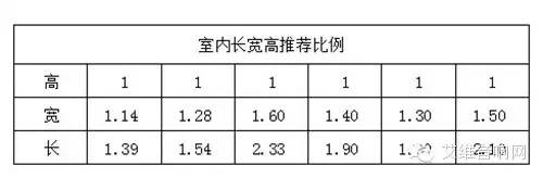為避免以上聲學缺陷的產(chǎn)生,可以由前述所知,規(guī)則的體型容易在室內造成聲學缺陷。尤其是空間的長寬高比例是整數(shù)比的情況下。因此可在空間體型設計之初,確定室內空間大小時調整長寬高的比例。理想的長寬高比例是1:21/2:21/3,通常建筑設計條件很難滿足理想比例,以下表中的推薦比例可作為設計初期的參考。