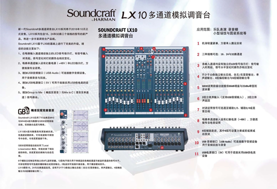 新一代的LX10沿用了已成為行業(yè)典范的Soundcraft MH3與MH4的4段參量均衡器和GB30話放;且在上一代的基礎(chǔ)上增加了5種新的實用功能,輸入通道每通道獨立隨信號強弱變化而改變顏色顯示的LED指示燈、輸入通道單獨+48V幻象電源控制、內(nèi)置USB音頻接口聲卡直接連接你的數(shù)字音頻工作站進(jìn)行音頻錄音與回放、增設(shè)多功能USB 5V電源接口、支持將Group 編組信號發(fā)送至主輸出混音母線MIX和主輸出混音母線MIX信號發(fā)送至C單通道母線兩種信號路由方式式。這些都極大的提高了我們實際應(yīng)用是的便捷性。