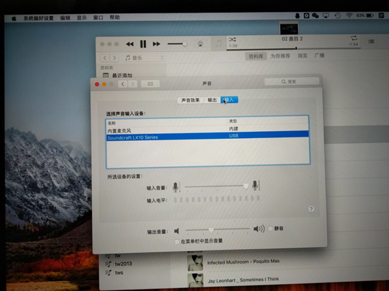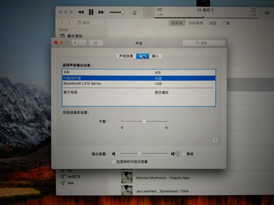 圖20:這里用的是OS系統(tǒng)自帶播放器,有些播放器可能需要在軟件本身再做一次聲卡輸出的選擇。另WIN系統(tǒng)也一樣要先把系統(tǒng)聲音輸入輸出選項有電腦本身揚聲器改為LX10調(diào)音臺聲卡;低版本的WIN系統(tǒng)有可能還需要安裝LX10聲卡驅(qū)動。