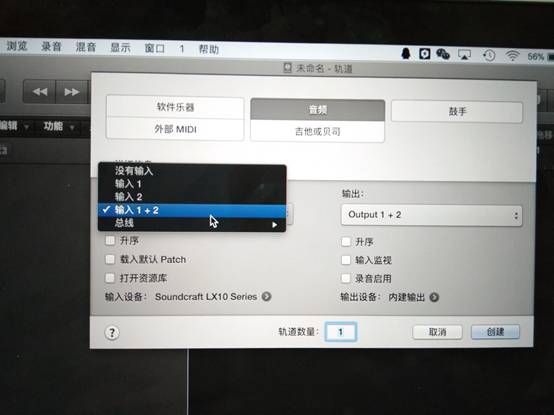 圖27:設(shè)備選擇好后選擇輸入通道,可以選擇單通道(這樣的話就要建兩個軌道)這里選擇的是1+2模式一個軌道錄制立體聲。選擇好后入圖28所示。