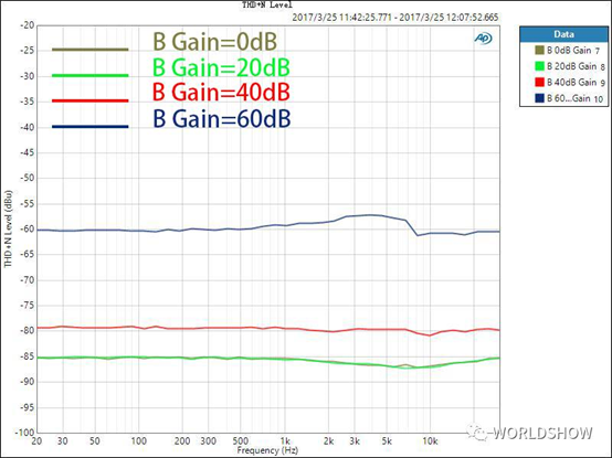 對于數字調音臺,我們不僅要關心話放增益在0dB時的THD+N比率,還需要了解到,話放增益在不同位置時的情況,因為這是使用中的實際情形。話放的增益在不同大小時,其引入的噪音和失真也是不同的,了解這一點對于用戶正確設置增益也很有參考意義。