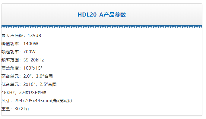 HDL20-A是一個可以快速簡單設置的高性能的線性陣列。該音箱擁有1400W峰值的2路數字功放。聲音由DSP處理,它可根據陣列音箱的數量和室內外環境來設置高頻的參數。 該系統采用了最先進的RCF單元,兩個10”的單元用于低音再現和一個3.0”音圈的高音單元,用于提供高清晰度的聲音。