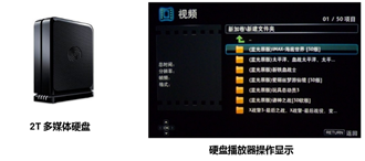 您也可以選擇播放外掛的2T多媒體硬盤上的內(nèi)容。2000G的海量存儲空間,可存儲成百乃至上千部的海量電影、電視劇、音樂CD等等,內(nèi)容可以自由拷貝、隨時更新??梢詽M足家人所有要求,有孩子動畫片、年輕人喜歡的好萊塢大片、妻子喜歡的愛情片和連續(xù)劇、父母喜歡的戲曲或經(jīng)典老片等等。