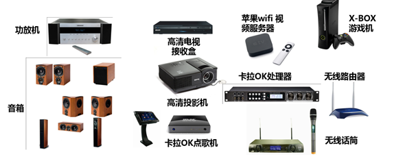 1)投影機、高清藍光播放機、點歌機、互動游戲機、高清電視機頂盒、卡拉OK機、無線話筒、功放機、空調(diào)機、網(wǎng)絡路由器等等多達十幾種設備;