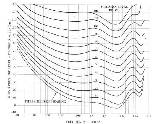 在進行聲壓級計算前,必須選擇一個相應環境下合適的基準聲壓級,而基準聲壓級的選擇必須了解正常人耳的等響曲線,即“Fletcher-Munson curves(弗萊徹芒森曲線)”。