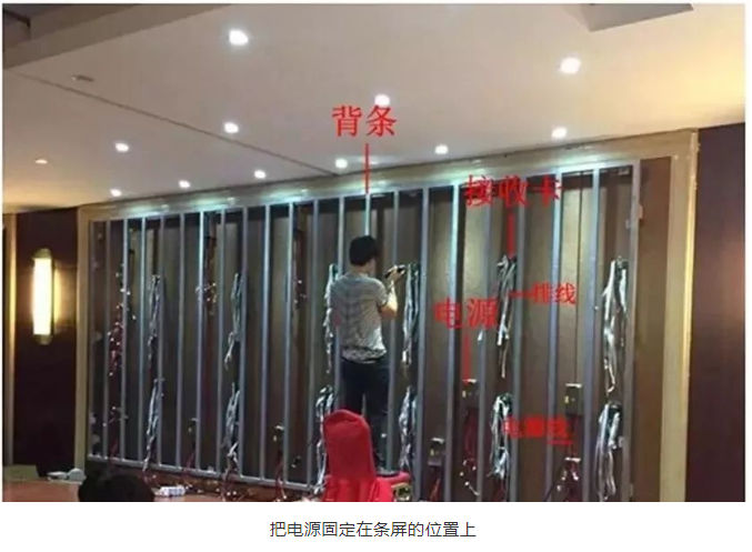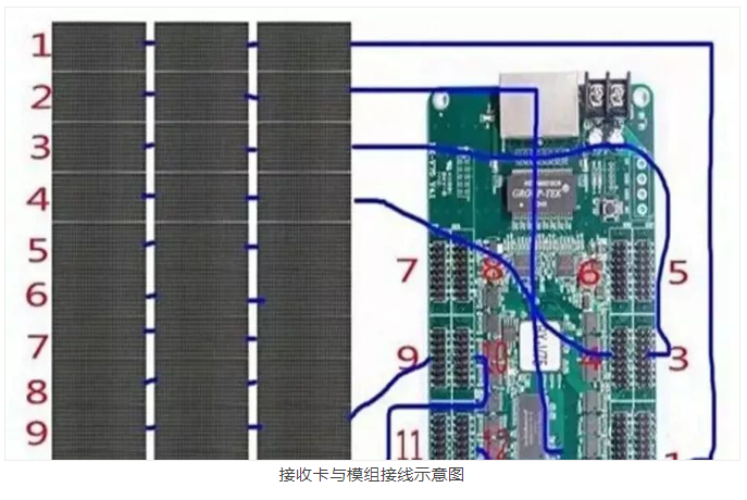 從配電室到LED顯示屏配電柜的電纜在安裝屏幕之前就必須布置好,電源接好后裝控制卡,控制卡這里用的是同步接收卡。整個電源和控制卡的布置,LED顯示屏出廠都是有《電源及系統布線圖》的,只要嚴格參照圖紙走線就不會出錯。一般工程師自己根據電源和卡的數量也可以估算出走線方式。