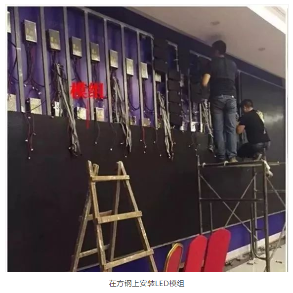 扣好不銹鋼邊后就能開紿上模組了。模組建議從下往上裝,從中間往兩邊開始安裝。這樣的安裝方式有很多爭議,從底部安裝主要是為了使水平和垂直都能在正常控制范圍內,特別是屏幕的面積大了以后,更加容易失控,特別是小間距的要求超高,有點縫隙沒有達到要求,都需要做精細的調整。