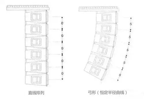 線陣列揚聲器系統是由一列單元箱組成,這些單元箱按一定規則排列,根據聲場需要可以排成直線、弓形(恒定半徑曲線)、“J”字形和漸開線等。