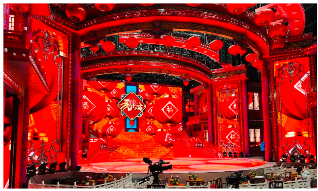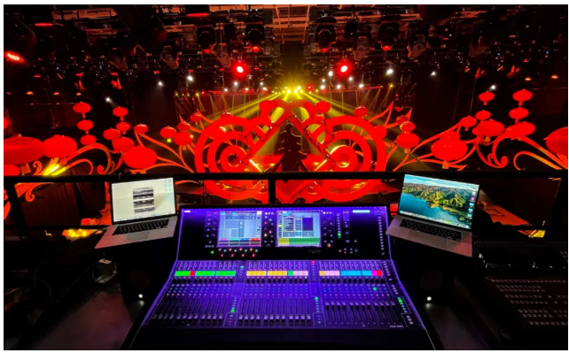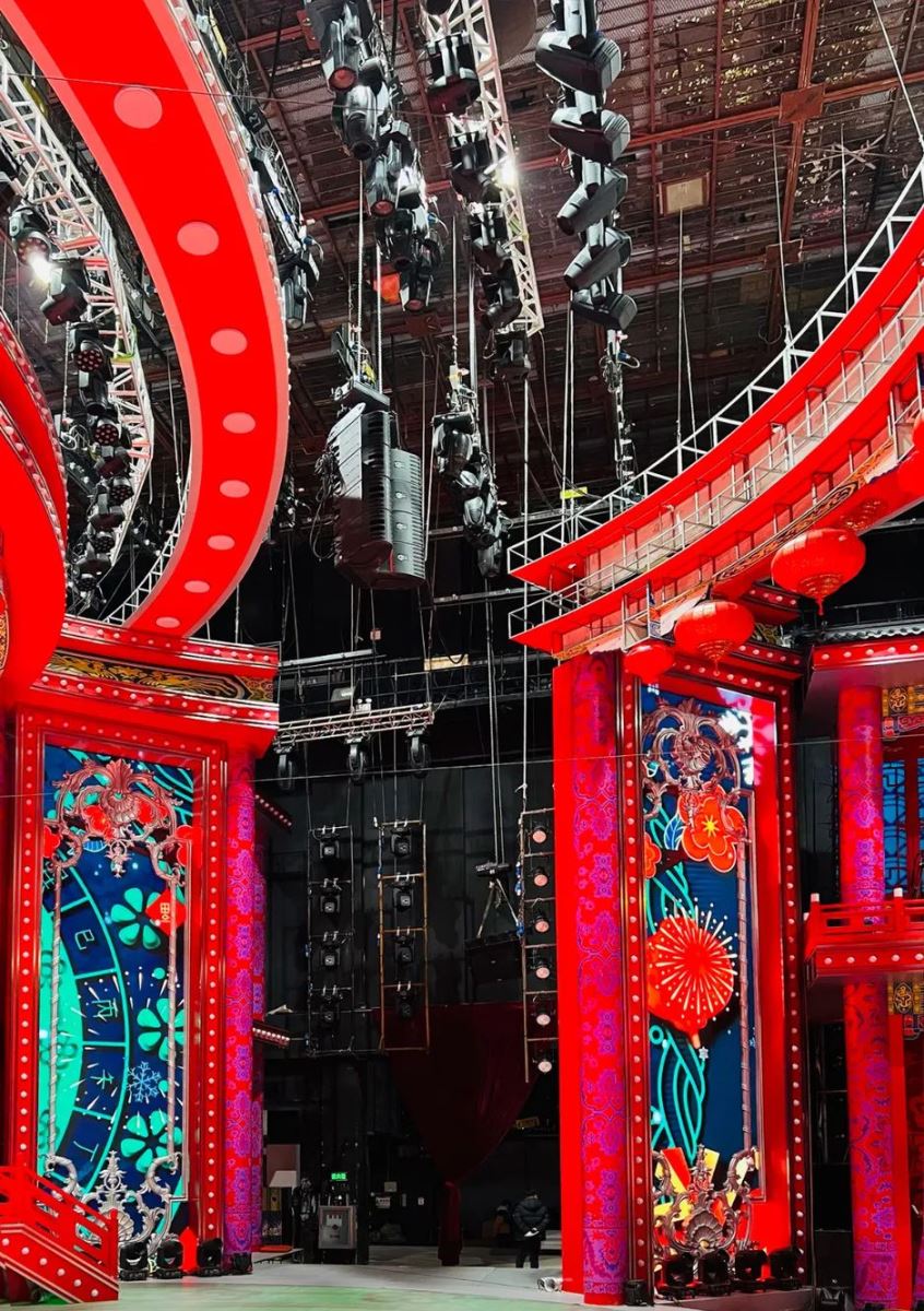 此次遼視春晚舞美設(shè)計(jì)較為復(fù)雜,舞臺(tái)頂部使用了喜慶的中式風(fēng)格,有中式建筑的頂部橫梁,還懸掛有多只大紅燈籠。為滿足拍攝的美觀需求,曾多次調(diào)整主擴(kuò)系統(tǒng)的吊裝高度和位置,最終主系統(tǒng)被吊掛在舞臺(tái)兩側(cè)上空10.5米的高度,隱藏在中式風(fēng)格弧型橫梁的后部,毫無違和感。