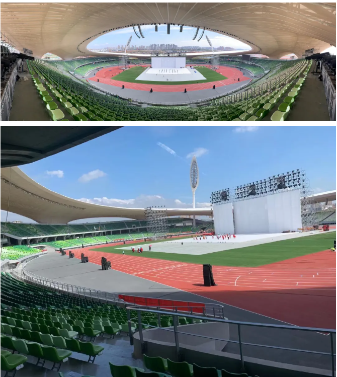 為確保現場最佳的視聽體驗效果,本屆體育大會擴聲系統采用源自德國的EV32只X1I-212/90-FGB垂直線性陣列搭配12只X2-212/120心形指向性超低作為主擴組合,16只EVF-2151D垂直線性陣列搭配4只X12-128次低頻音箱及8只EVF-1181S超低音箱作為兩側補聲組合,主席臺和演員返聽由8只多功能鏡像全頻揚聲器MFX-15MC擔任,整個擴聲系統由32臺PX5:4功放進行驅動。