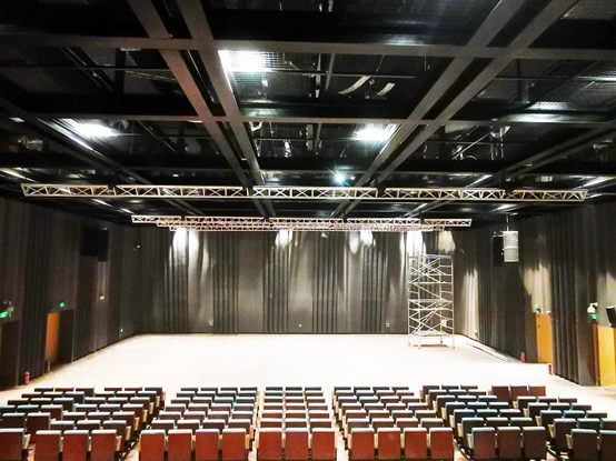 音樂廳設(shè)兩層觀眾席。綜合功能需求和場地大小,使用左右主擴(kuò)的配置方式。主擴(kuò)聲系統(tǒng)安裝在舞臺(tái)兩側(cè)上空,負(fù)責(zé)一層池座以及二層樓座的所有觀眾席覆蓋。得益于VUE音響小尺寸大聲壓的技術(shù)特點(diǎn),一二層觀眾席在沒有補(bǔ)聲情況下,只靠兩組線陣列覆蓋也可以讓音樂廳的擴(kuò)聲系統(tǒng)聲學(xué)特性指標(biāo)達(dá)到國標(biāo)文藝演出類一級(jí)標(biāo)準(zhǔn)。