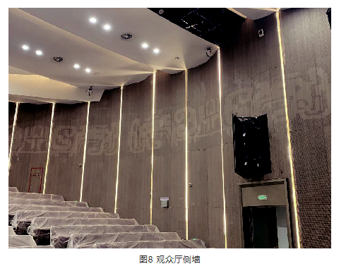 2) 墻面穿孔吸音板背襯基層板,穿孔吸音板與基層板緊貼。既取消了墻面吸聲,又不影響裝飾效果。如圖7、圖8所示。