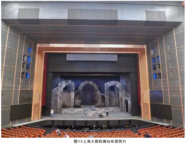 當(dāng)然并不是所有的歌劇場景都使用布景,而舞臺的體量比較大,如果不做吸聲處理,舞臺上的混響時間會非常大,既會影響歌手之間的相互聽聞,而且還會降低歌手唱詞的清晰度。因此在主舞臺上懸掛厚重的幕布和側(cè)后舞臺墻面上布置吸聲材料是很有必要的,目的就是降低舞臺空間的混響時間。