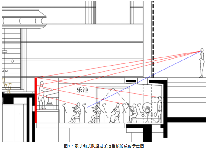 由于樂池的下沉,歌手和樂隊(duì)彼此之間大多數(shù)看不到對方,也就是說他們之間缺乏直達(dá)聲進(jìn)行交流,通過反射面提供<35ms的早期反射聲進(jìn)行交流就至關(guān)重要。樂池欄板是歌手和樂隊(duì)之間最近的反射面(見圖17),因此欄板必須是硬的反射面。蘇州灣大劇院樂池的右側(cè)欄板采用透空做法(見圖18),優(yōu)點(diǎn)是可以提高了樂隊(duì)的聲級特別是高頻聲,增加樂隊(duì)演奏聲的亮度。但是卻產(chǎn)生了三個不利因素:一是打破了歌手和樂隊(duì)之間的平衡,使樂隊(duì)聲能可能蓋過了歌手;二是減少了歌手和樂隊(duì)之間的早期反射聲交流,不利于演出的同步性;三是觀眾可以隱約看到樂譜燈光,干擾觀看演出。綜合考慮這種做法并不可取。