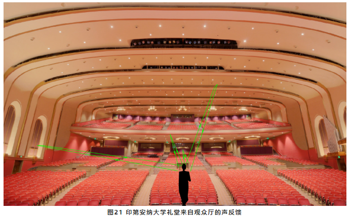 在歌劇院中,歌手和樂隊(duì)都需要聽到來自觀眾廳的聲音反饋,然后根據(jù)反饋的聲音相應(yīng)地控制自己的歌唱和演奏的響度。歌唱歌手特別希望喜歡聽到他們的聲音在一個比較舒暢的發(fā)聲水平時能“充滿大廳”。這就需要池座的后墻、挑臺欄板以及吊頂?shù)炔课荒軌驅(qū)⒙曇舴瓷涞轿枧_和樂池內(nèi)。但需要合理控制反射聲的大小,避免反射聲太強(qiáng),成為回聲。