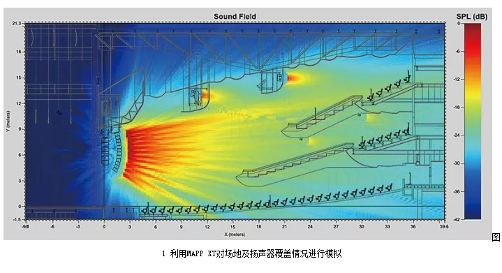 當獲得足夠的場地信息之后,需要利用揚聲器廠家提供的模擬軟件(或者通過Ease Focus這種基于GLL文件的通用設計軟件)進行建模,這些軟件可在可視化的條件下,實時調整并計算不同設計方案的覆蓋均勻度以及聲壓級分布,較為復雜的模擬軟件(如Ease)甚至可以將反射和墻面材質的吸聲特性都考慮在內,實現(xiàn)對反射情況的模擬(見圖1)。系統(tǒng)建模和預測的重要作用在于讓系統(tǒng)工程師在裝臺開始之前就能夠做好全部的計劃和準備工作,進而起到減少正式施工時長并提高工作效率的作用。