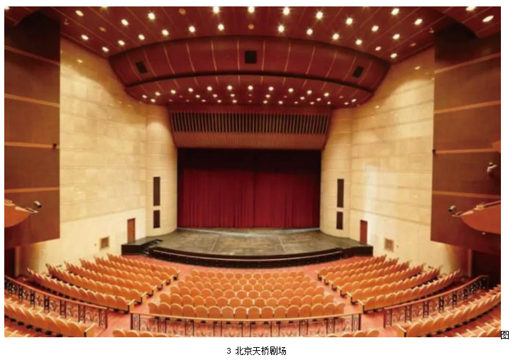 標準劇場中,中置揚聲器組的安裝通常分為暗裝和明裝兩種。暗裝一般是安裝在舞臺鏡框上沿預留的聲橋當中,如北京天橋劇場(圖3)。明裝則是吊掛在舞臺燈桿或預留的吊點上,如北京天橋藝術中心大劇場(圖4)。暗裝對觀眾的視覺影響最小,如果劇場擴聲系統(tǒng)設計合理,建筑聲學指標達標,且在鏡框高度不是很高的情況下,劇場中置聲道暗裝是最好的安裝方式。但是國內劇場的實際情況并不樂觀,且不同演出的系統(tǒng)工程師和音響設計師都有各自的設計和考量,暗裝中置聲道位置又基本不可調整,所以很多劇場中暗裝的中置聲道使用率很低。明裝的中置聲道更便于安裝、拆卸以及調整,更加適合流動性強的演出,因此,越來越多的現(xiàn)代化劇場采用這種安裝方式。