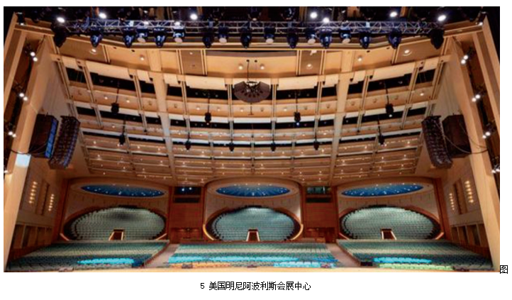 此外,還有一些劇場由于應用場景的不同,揚聲器系統(tǒng)既要減少舞臺垂直方向上對觀眾的視覺影響,還要滿足較寬觀眾席對水平覆蓋的需求。例如美國明尼阿波利斯會展中心使用ARCS恒定曲率線陣列揚聲器,這種揚聲器陣列在垂直方向上的輻射角度不可調整,但水平角度上中置揚聲器幾乎可以覆蓋到整個觀眾席,甚至可以比左右聲道揚聲器承擔更大的功率,這對于以語言類為主的會議等應用場景來說是十分方便且有效的。