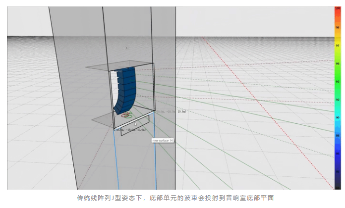 在暗裝的方式下音響室空間通常狹小緊湊。在本項目中,音響室的底部平面距離陣列僅10厘米。如果采用傳統線陣列的擴聲系統,陣列會形成J字型物理姿態,不僅占用較大的安裝空間,J型底部的音箱單元還有可能將聲能投射到音響室的底部平面上,導致大部分高頻能量無法穿透出來,從而無法覆蓋到一部分前區的觀眾區。選用Anna,它的垂直吊裝方式既能節約了安裝空間,還能將高中低頻單元統一的盡可能靠近透聲幕,躲避音響室底部平面對波束的遮擋,最終實現幾乎全場的覆蓋。
